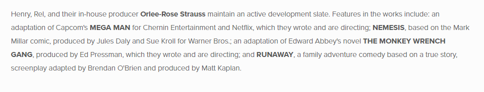 Henry, Rel e a produtora interna Orlee-Rose Strauss continuam em desenvolvimento ativo. Entre os filmes em planejamento estão: uma adaptação de Mega Man, da Capcom, para a Chernin Entertainment e Netflix, que eles [Henry e Rel] escreveram estão dirigindo.