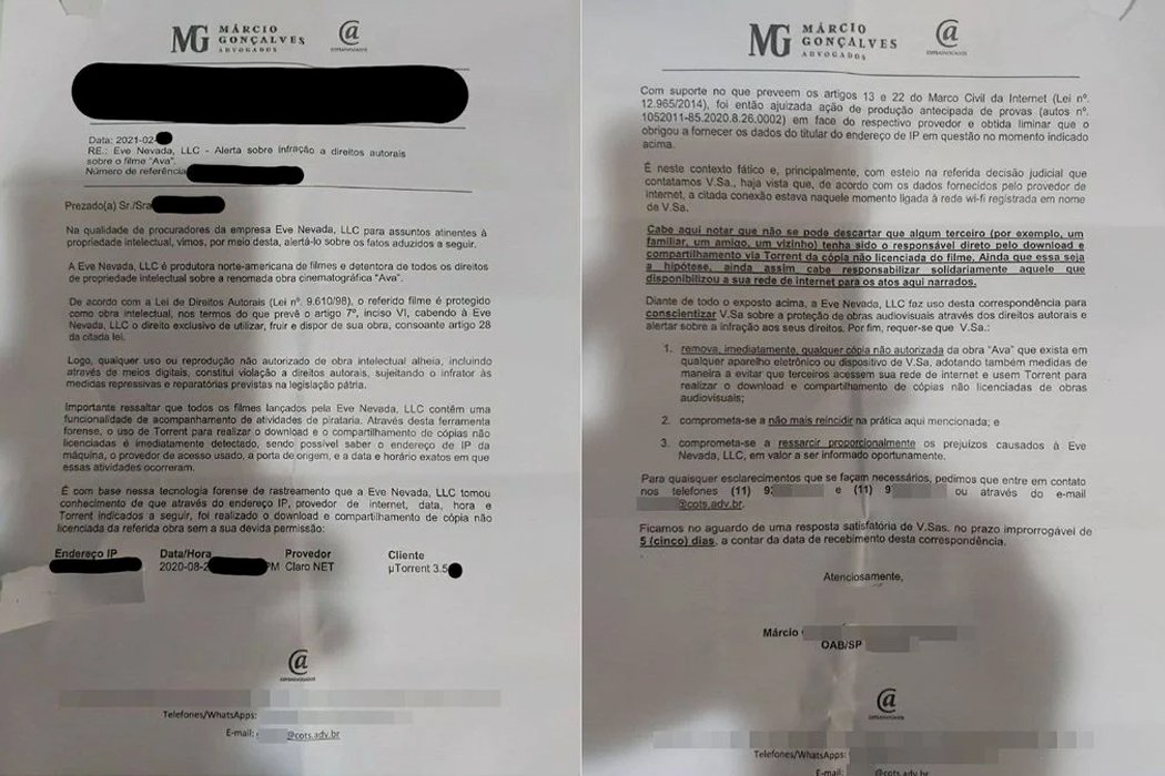 Repetindo o que aconteceu em dezembro de 2020, alguns usuários de internet brasileiros receberam notificações extrajudiciais depois de fazerem o download de filmes de forma ilegal. O crime ocorreu com filmes como Posto de Combate, After: Depois da Verdade e Ava. As informações foram divulgadas pelo Canaltech.